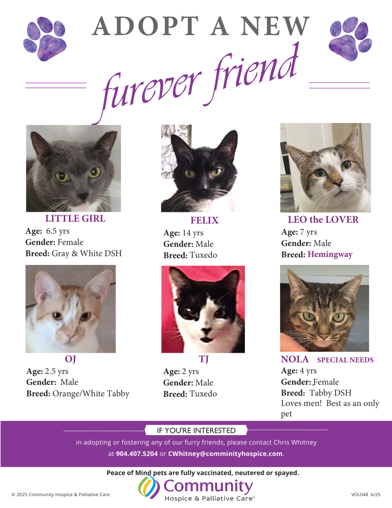 If you are interested in becoming a pet foster for Community Hospice & Palliative Care’s Pet Peace of Mind Program, please review the available slots below and click on the button to sign up. If you would like more information about this opportunity and our program, please contact Chris Whitney at (904) 407-5204 or email CWhitney@communityhospice.com. Thank you!